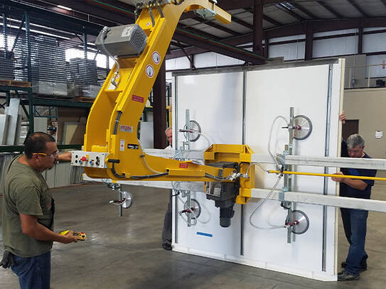The outdoor shelters that INTERTEC makes are typically single-storey buildings providing protected operating environments for analyzers and other process instrumentation and control equipment - in custom shapes and with footprints of up to around 300 square feet. To simplify such manufacturing, the new Houston facility has been fitted with a five-ton crane mounted on a gantry with a 100 x 45 feet working area - allowing INTERTEC to assemble and move plant buildings through manufacturing stages easily. Further investments include a vacuum-based materials handling system for lifting and precision positioning of GRP wall and roof panels.