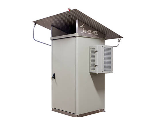 INTERTEC's hybrid shelter cooling concept is being demonstrated using a model with LED lighting effects that illustrate the natural circulation principle of passive cooling systems. INTERTEC's demonstration model also illustrates a radical new form of shelter configuration that can dramatically reduce plant building sizes, and greatly simplify construction and installation. Known as the PERI SHELTER, it makes all the system components that are required for normal operation accessible via the building's exterior. Panel-mounting enclosures on the exterior provide access to electrical connection and I/O termination points, and cooling systems. Touchscreen HMI panels can also be fitted to external walls, allowing operators on the ground to monitor a control element such as a PLC or make adjustments to control programs locally via an inspection door.